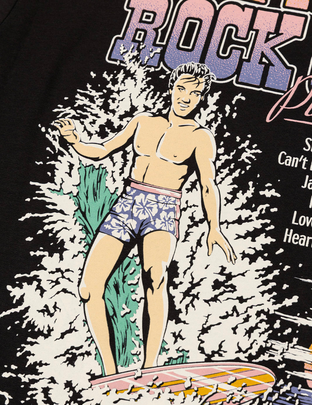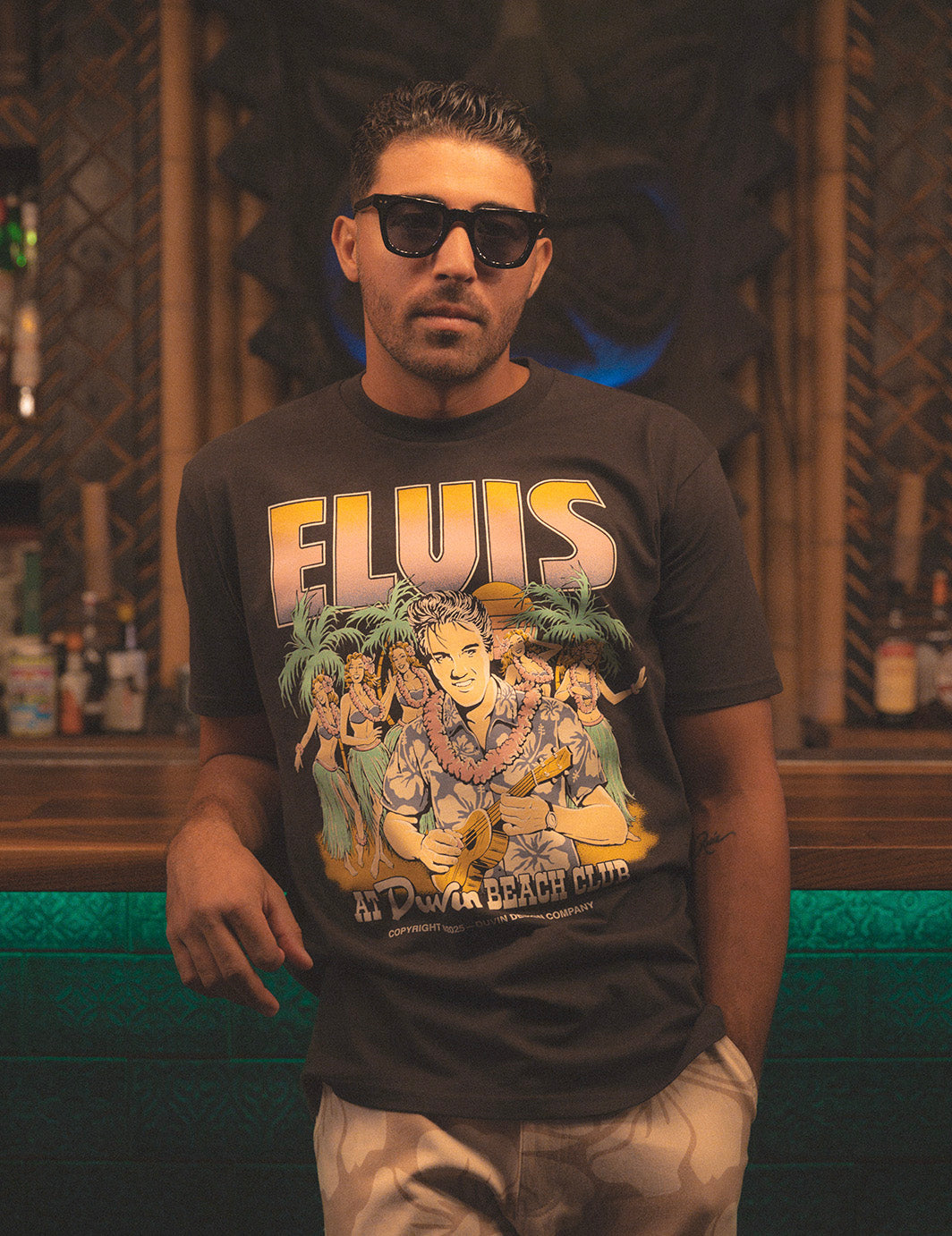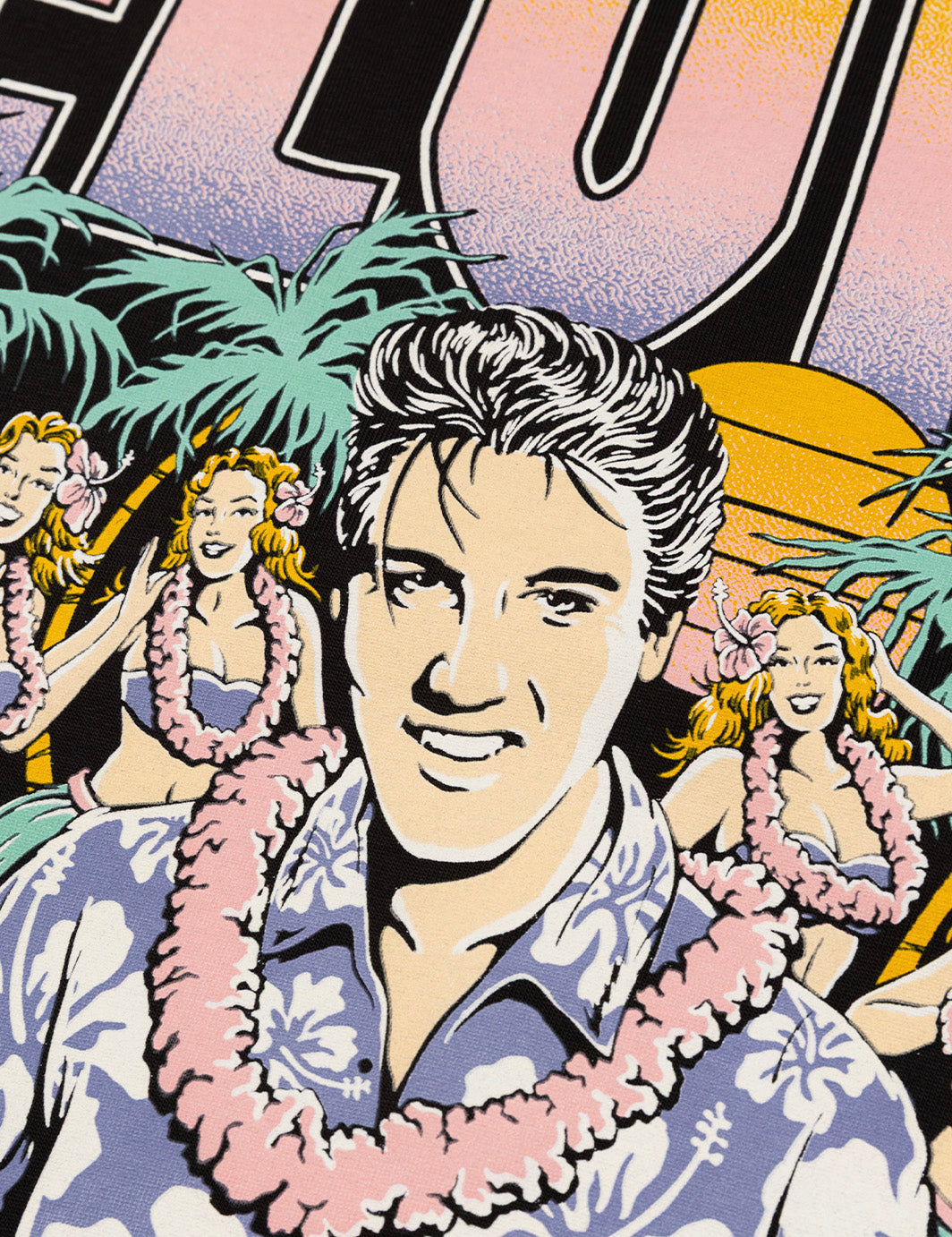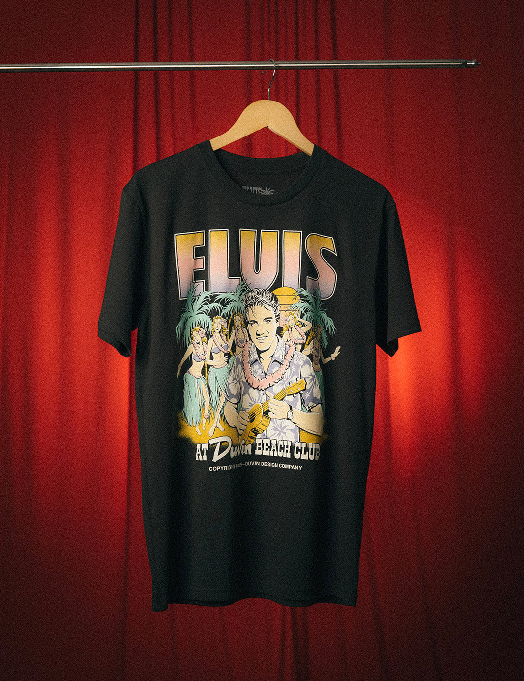 Elvis in full island mode... Ukulele in hand, surrounded by hula dancers and palm shadows. A hand-drawn, sun-faded graphic on our soft standard fit tee. Vacation energy, all year long.