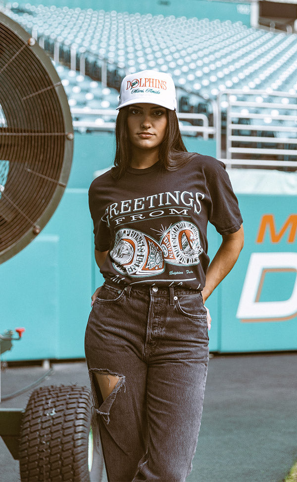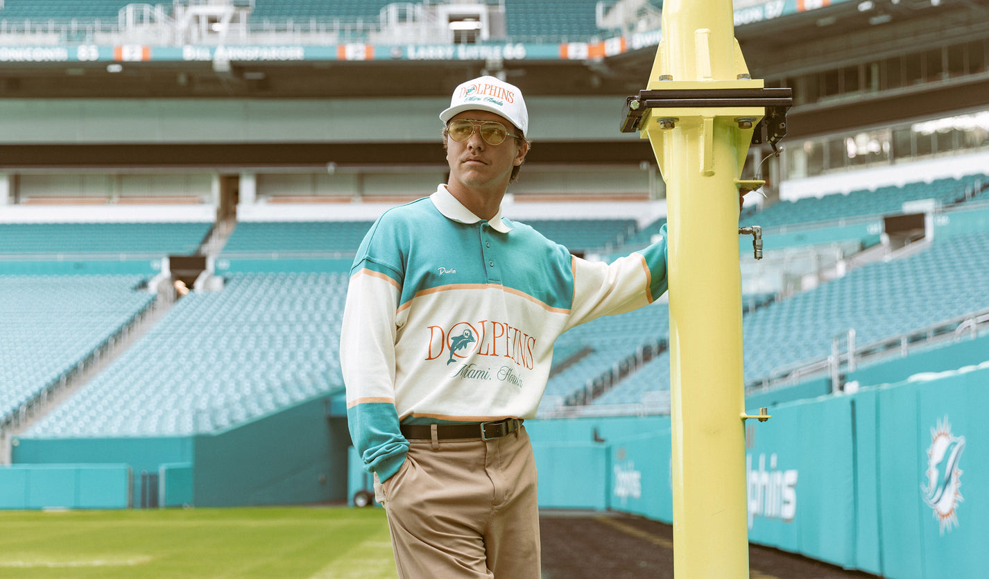 The collection references the Dolphins’ classic colors of the 60’s, adorned with championship rings, talismanic South Beach iconography, catamaran sails, palm trees, and more. Featuring a total of 8 styles, the collection pulls inspiration from vintage Dolphins graphics – reimagined with a Duvin twist – and retro Miami Beach aesthetics. Three t-shirts, a vintage rugby polo, a swim trunk, short sleeve cabana shirt, 5-panel hat, and work jacket round out the offering. The tees make a bold statement with Miami’s two Super Bowl rings, while the swim trunks rely on the iconic blue and orange motif rendered with retro-style vertical stripes –accentuated by a contrast Miami Dolphin logo. The short-sleeve cabana shirt – a classic Duvin style – reiterates the franchise’s heritage with a repeat-print of the championship rings