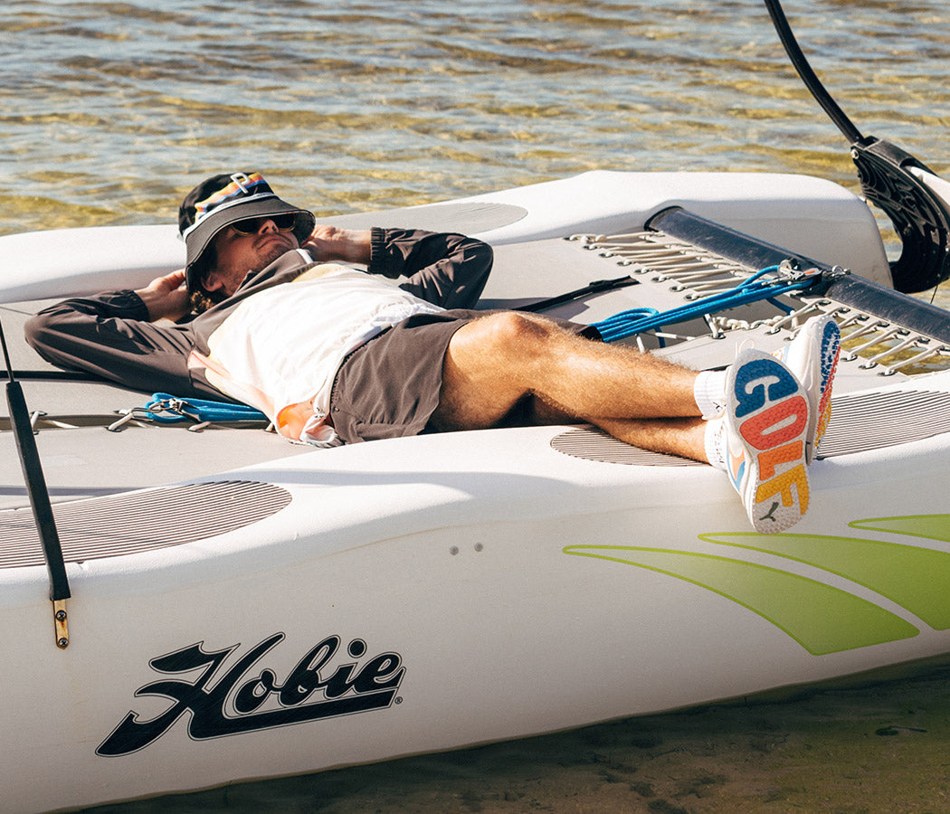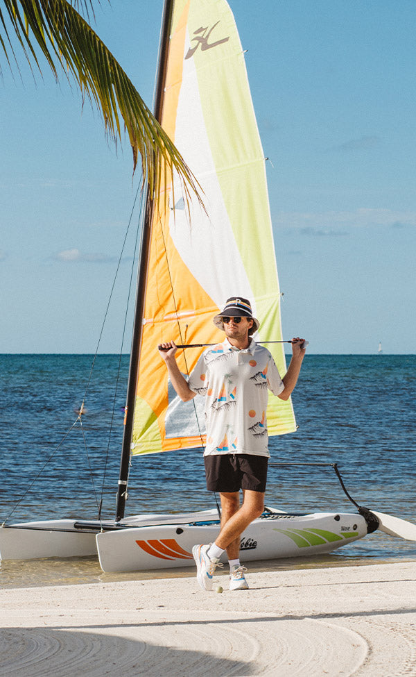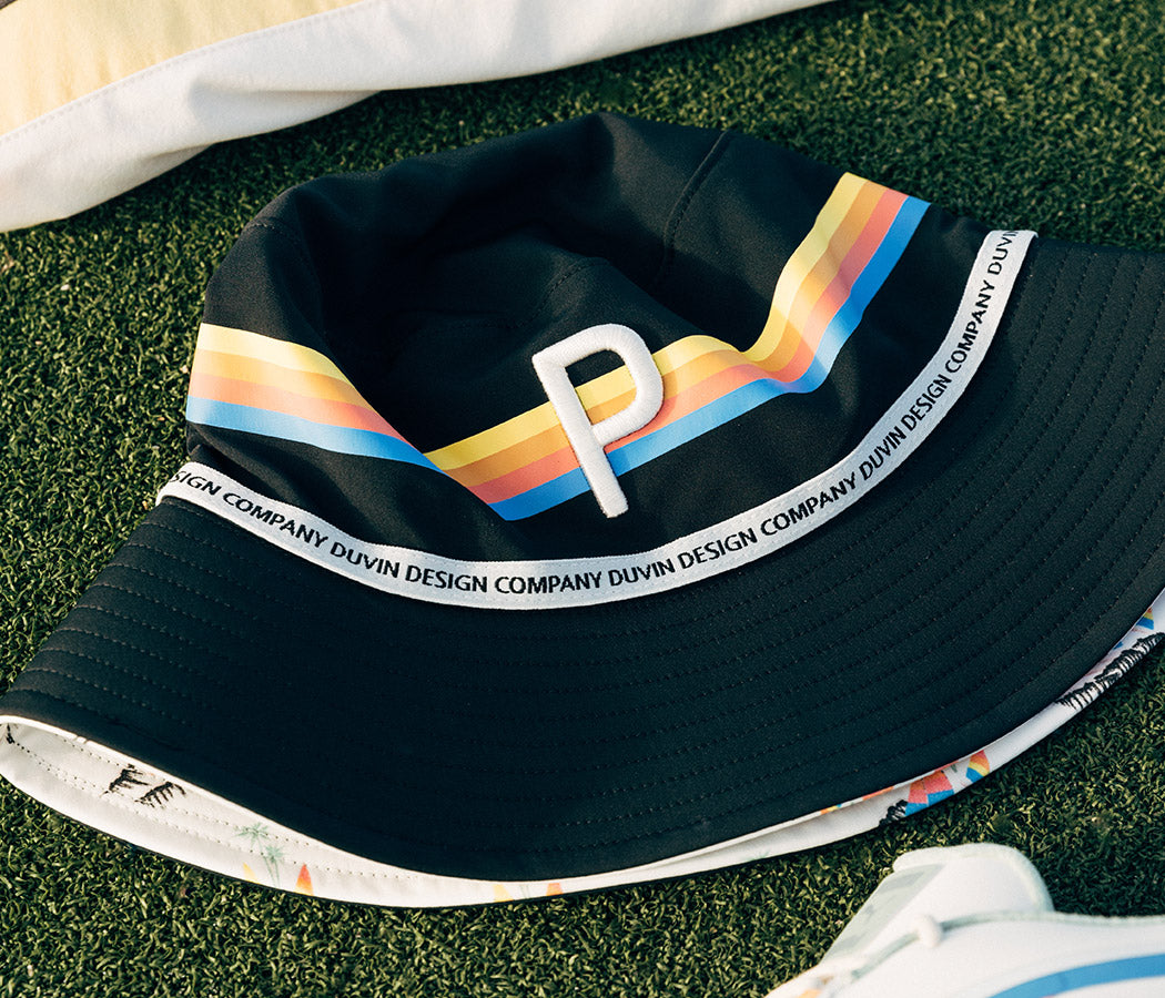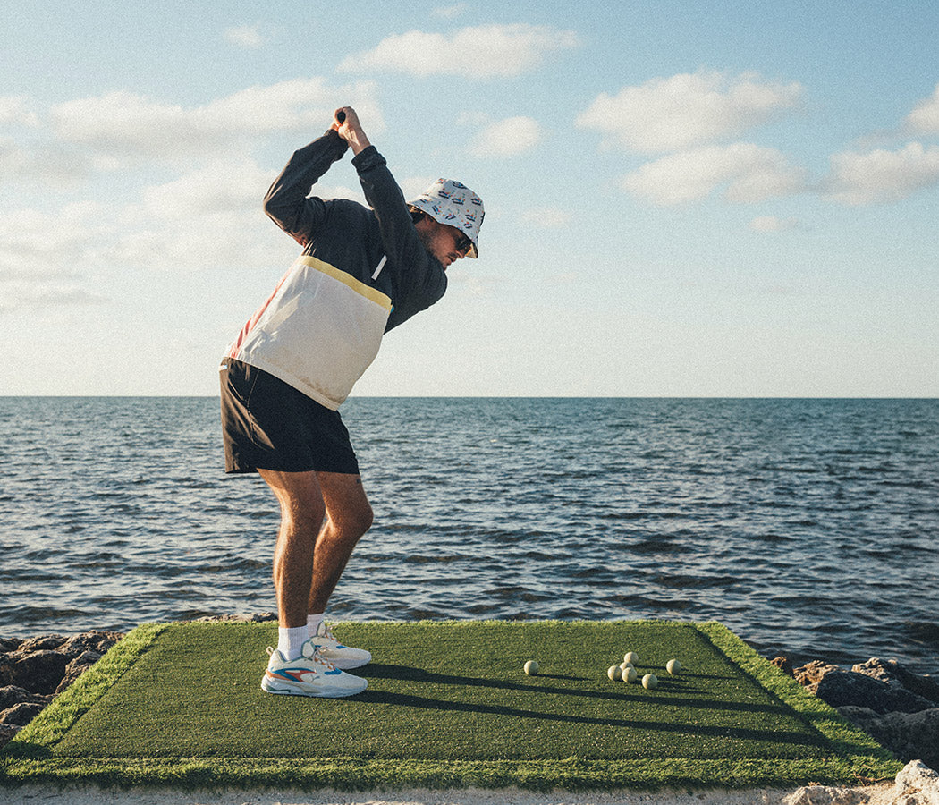 Drawing inspiration from vibrant 1980’s photos of Hobie Cat sailboats, the collection includes the first ever sneaker co-designed by Duvin, as well as a performance quarter-zip, shorts, a golf polo, and a reversible bucket hat, offering a complete head-to-toe ensemble for making a statement on and off the green. A pastel-infused nautical color palette takes center stage throughout, while a standout print featured on the polo and bucket hat of sails and palm trees, sets the tone for this season’s capsule.
