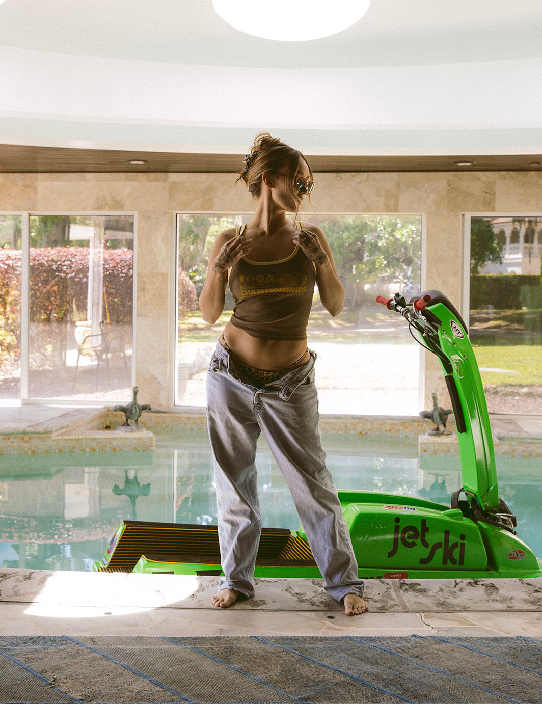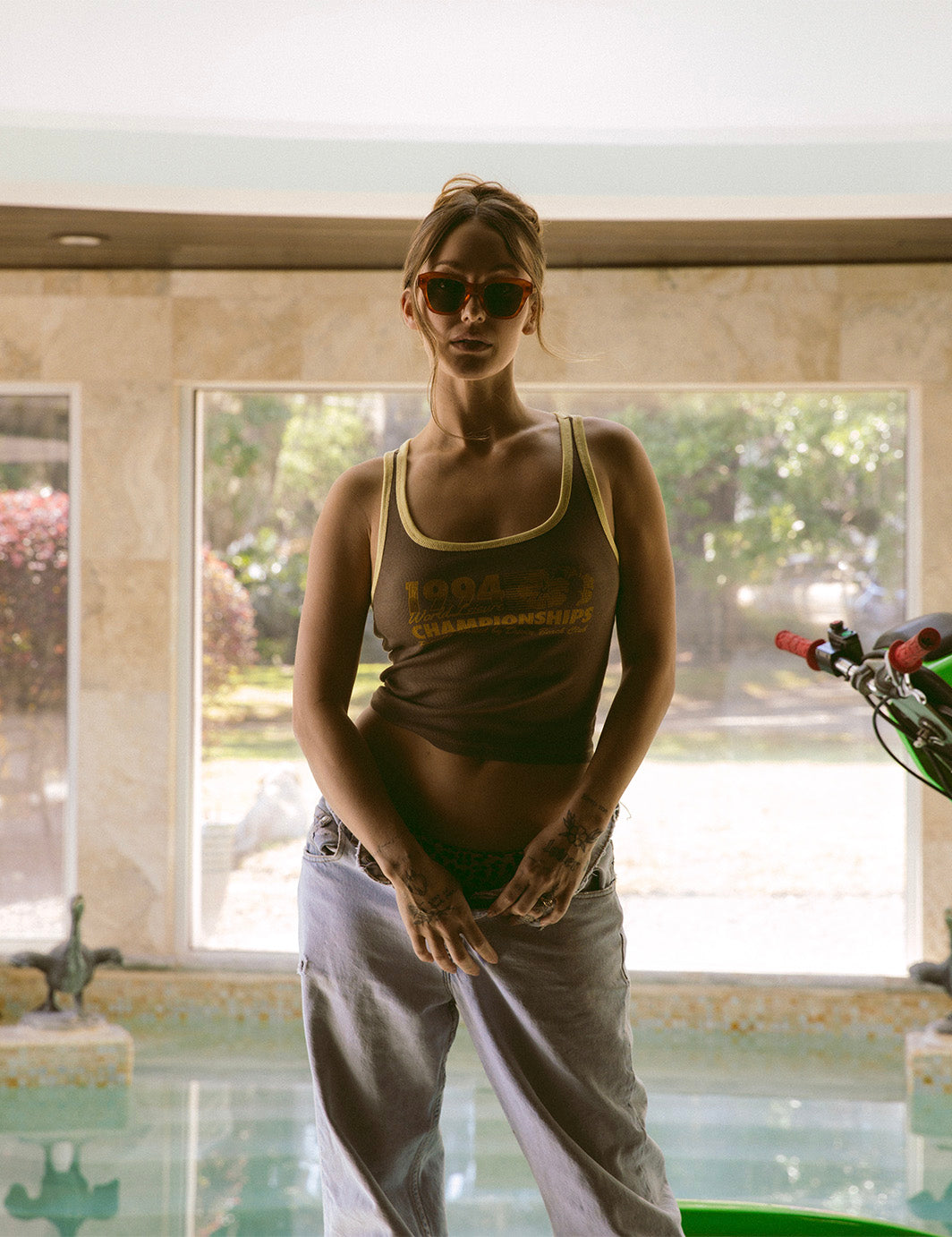 Jo (studio + lifestyle model) : 5'4" [34" Hips, 25" Waist] Wearing sizes (L Bikini Top, S Bikini Bottom, S Cabana Pants, S Cabana Shirt, S Tank, S Nylon Shorts, 26 Work Pants & 26 Walk Shorts)