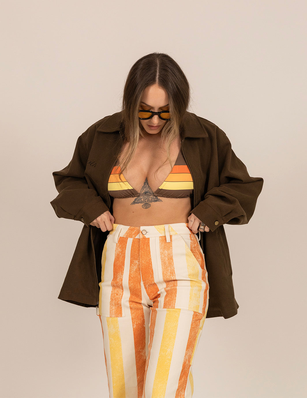 Jo (studio + lifestyle model) : 5'4" [34" Hips, 25" Waist] Wearing sizes (L Bikini Top, S Bikini Bottom, S Cabana Pants, S Cabana Shirt, S Tank, S Nylon Shorts, 26 Work Pants & 26 Walk Shorts)
