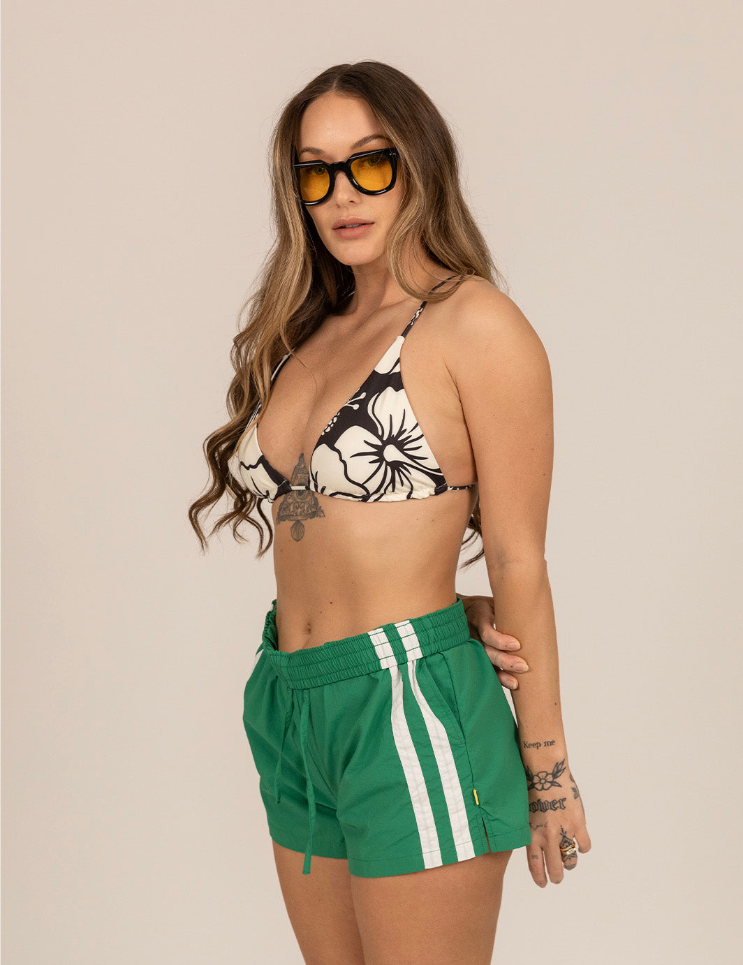 Amara (lifestyle model) : 5'5" [34" Hips, 25" Waist] Wearing sizes (SBikini Top, S Bikini Bottom, S Cabana Pants, S Cabana Shirt, S Tank, S Nylon Shorts, 26 Work Pants & 26 Walk Shorts)