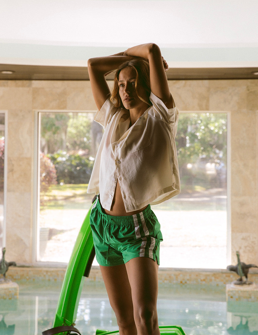 Jo (studio + lifestyle model) : 5'4" [34" Hips, 25" Waist] Wearing sizes (L Bikini Top, S Bikini Bottom, S Cabana Pants, S Cabana Shirt, S Tank, S Nylon Shorts, 26 Work Pants & 26 Walk Shorts)