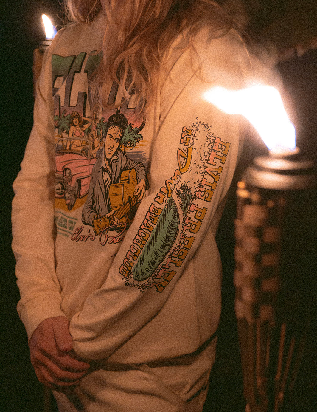 Retro illustrated front graphic of Elvis posted up with the whole beach crew in tow. Sleeve hits included to seal the tour-tee feel. Soft, lightweight, and ready for every golden-hour coast cruise.