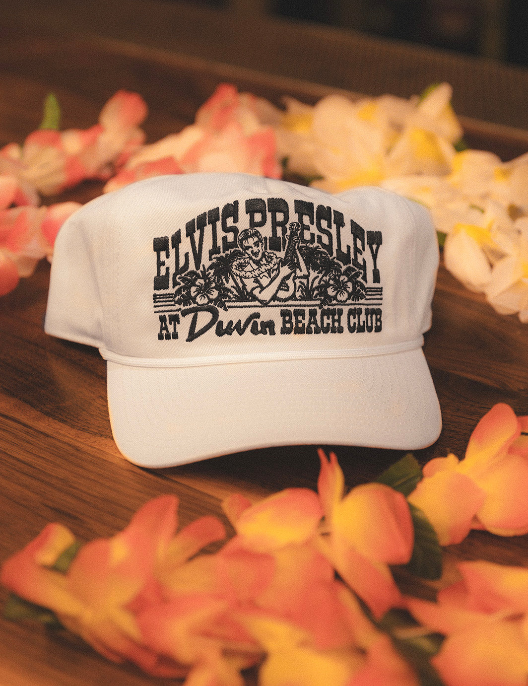 Vintage concert merch vibes for the beach crowd. Clean ivory base with bold Elvis embroidery.
