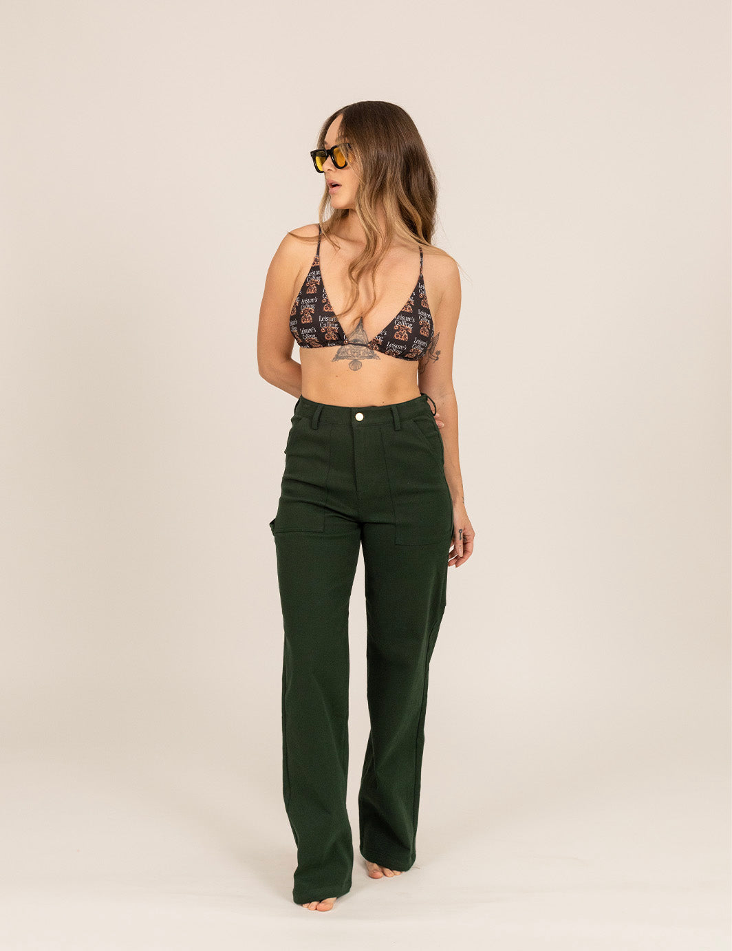 Jo (studio + lifestyle model) : 5'4" [34" Hips, 25" Waist] Wearing sizes (L Bikini Top, S Bikini Bottom, S Cabana Pants, S Cabana Shirt, S Tank, S Nylon Shorts, 26 Work Pants & 26 Walk Shorts)