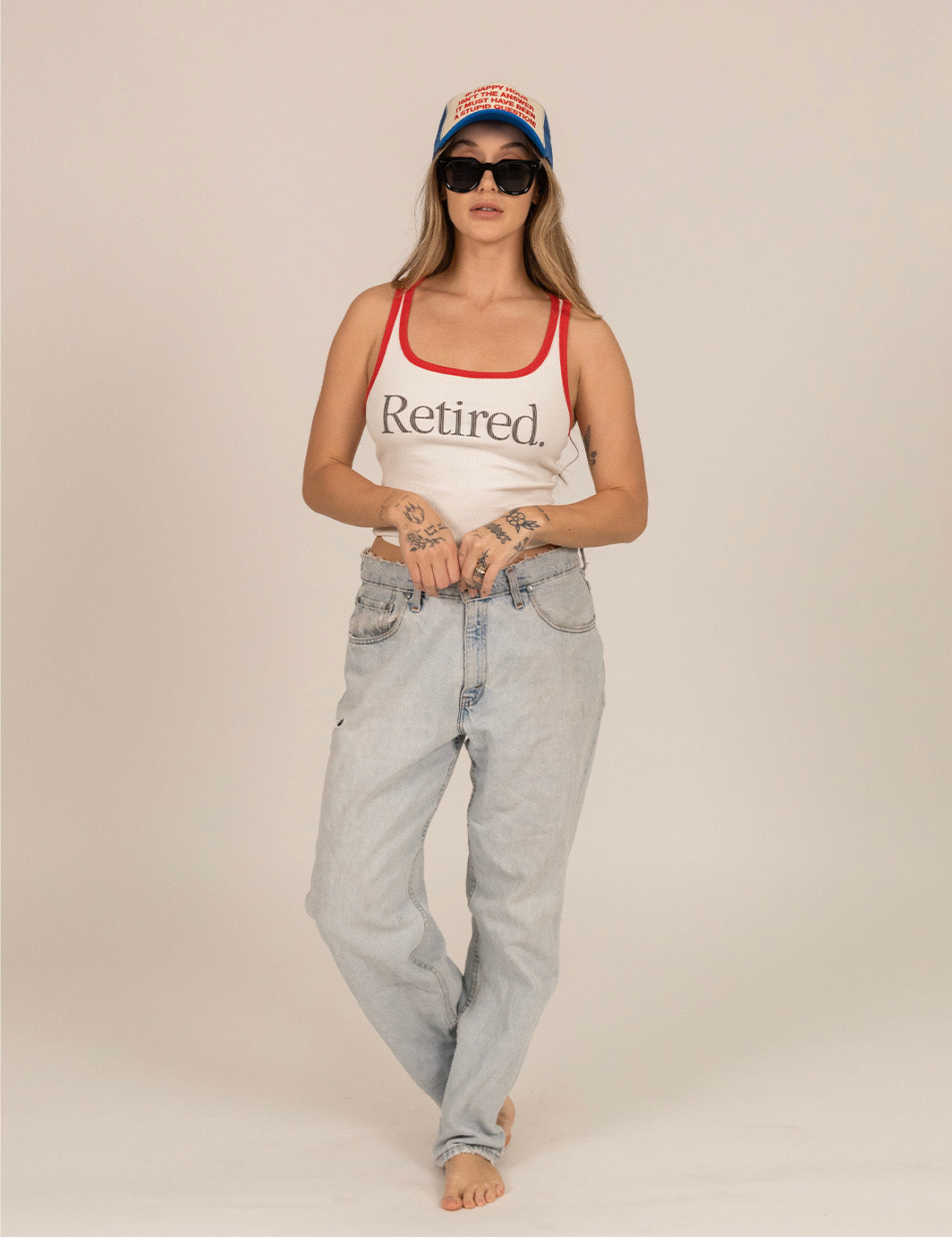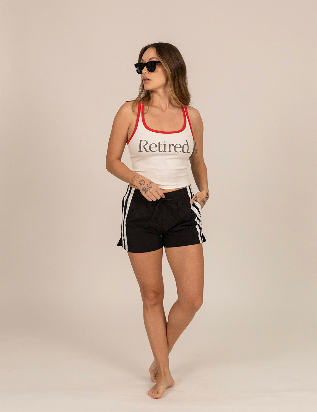 Jo (studio + lifestyle model) : 5'4" [34" Hips, 25" Waist] Wearing sizes (L Bikini Top, S Bikini Bottom, S Cabana Pants, S Cabana Shirt, S Tank, S Nylon Shorts, 26 Work Pants & 26 Walk Shorts)