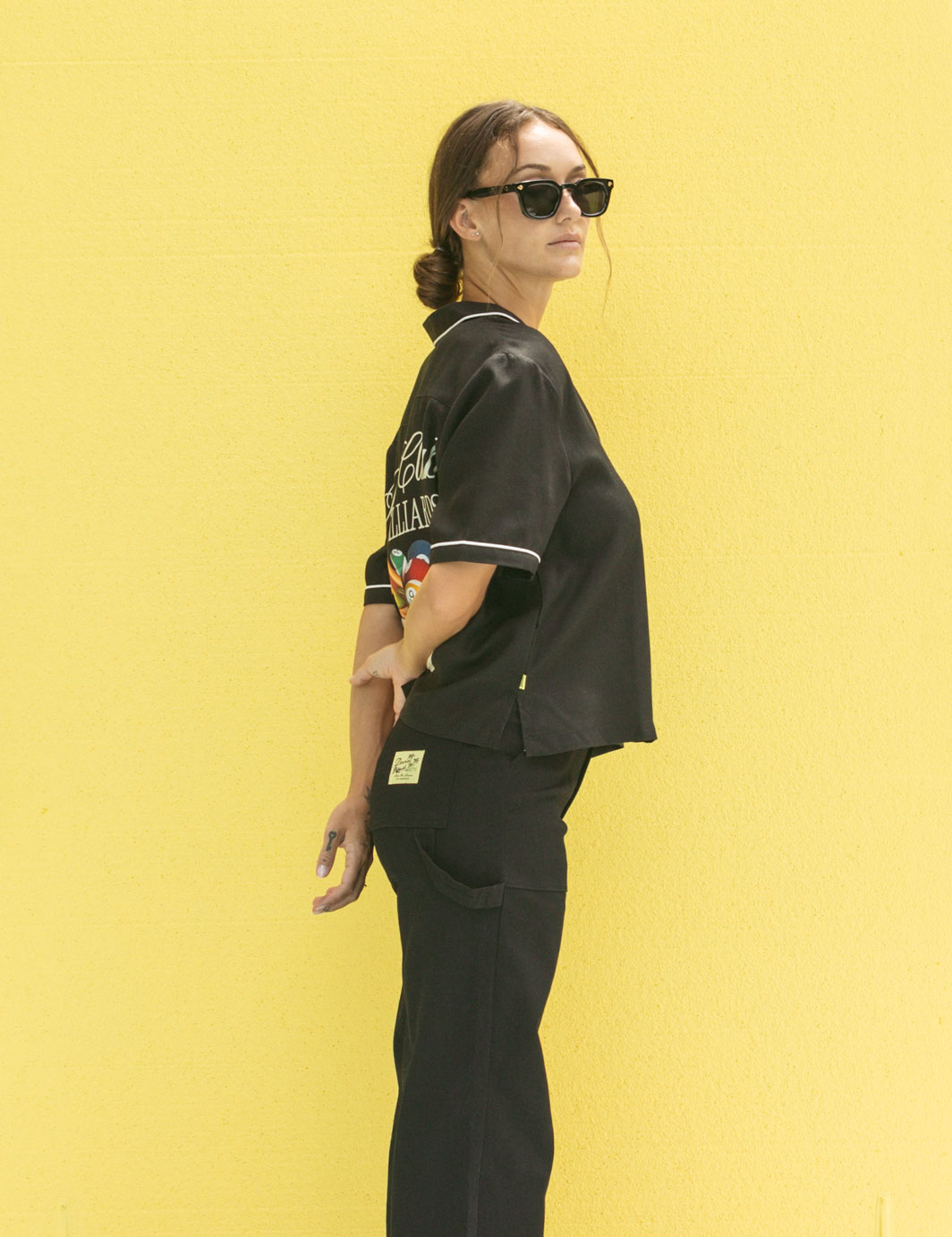 Jo (studio + lifestyle model)  5'4" [34" Hips, 25" Waist] Wearing sizes (L Bikini Top, S Bikini Bottom, S Cabana Pants, S Cabana Shirt, S Tank, S Nylon Shorts, 26 Work Pants & 26 Walk Shorts)